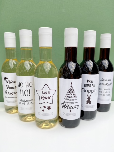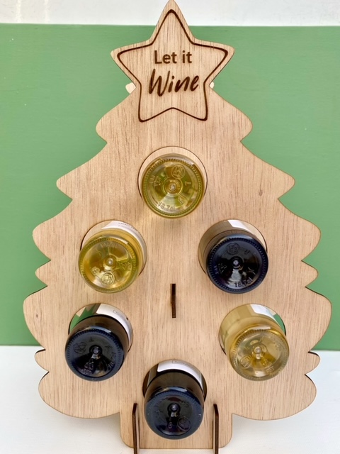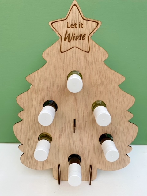 Super origineel houten Kerstboom Wijnrekje, makkelijk in elkaar te zetten en van licht en duurzaam hout. Inclusief 6 kleine flesjes wijn (187ml) met hilarische quotes op het etiket!